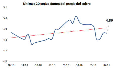 El precio del cobre registró una leve corrección esta semana, tras alcanzar su máximo histórico de US$ 5,02 por libra a fines de octubre. La caída se explica por la fortaleza del dólar estadounidense y la desaceleración de la actividad manufacturera china, donde las importaciones de cobre refinado retrocedieron 9,7% en octubre.
